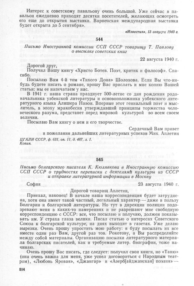 Письмо Иностранной комиссии ССП СССР товарищу Т. Павлову о высылке советских книг. 22 августа 1940 г. // ЦГАЛИ СССР, ф. 631, оп. 11, д. 487, л. 1. Копия.