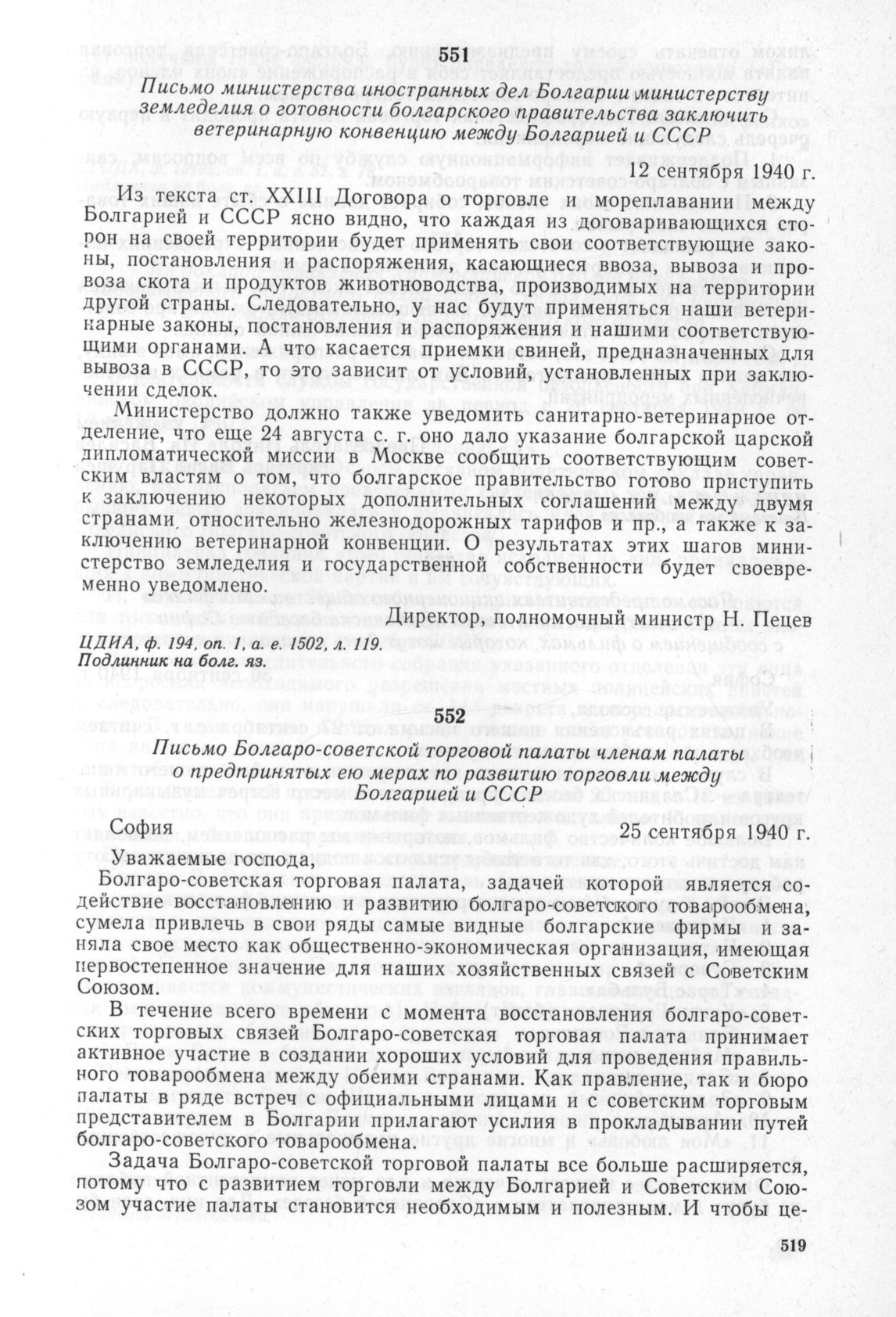 Письмо Болгаро-советской торговой палаты членам палаты о предпринятых ею мерах по развитию торговли между Болгарией и СССР. София. 25 сентября 1940 г. // ЦДИА, ф. 240, оп. 1, а. е. 22, л. 97. Печатный экз. на болг. яз.