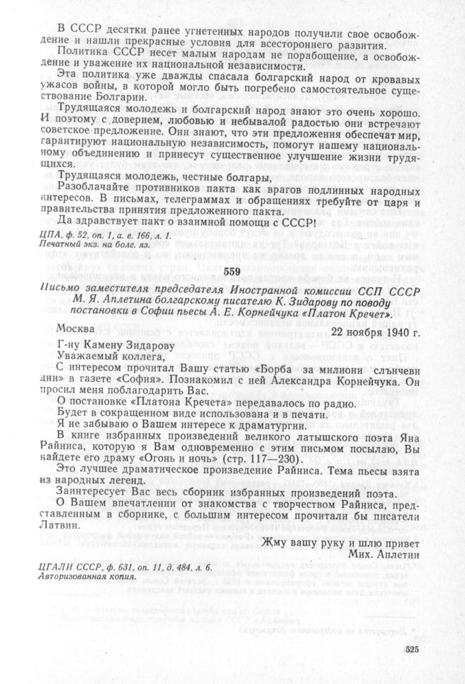 Письмо заместителя председателя Иностранной комиссии ССП СССР М.Я. Аплетина болгарскому писателю К. Зидарову по поводу постановки в Софии пьесы А.Е. Корнейчука «Платон Кречет». Москва. 22 ноября 1940 г. // ЦГАЛИ СССР, ф. 631. оп. 11, д. 484. л. 6. Авторизованная копия.