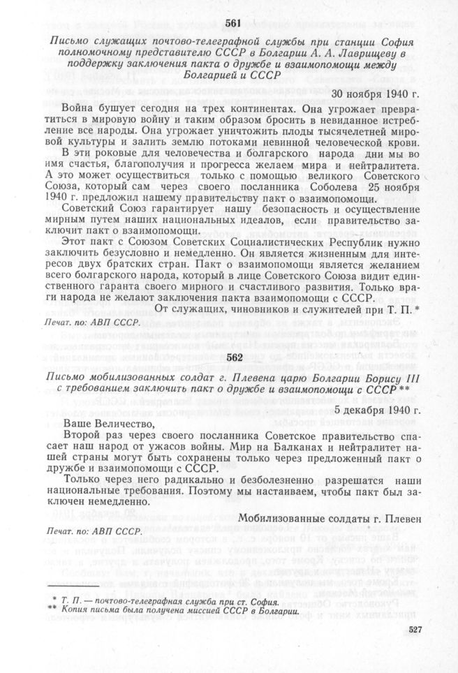 Письмо служащих почтово-телеграфной службы при станции София полномочному представителю СССР в Болгарии А.А. Лаврищеву в поддержку заключения пакта о дружбе и взаимопомощи между Болгарией и СССР. 30 ноября 1940 г. // Печат. по: АВП СССР.