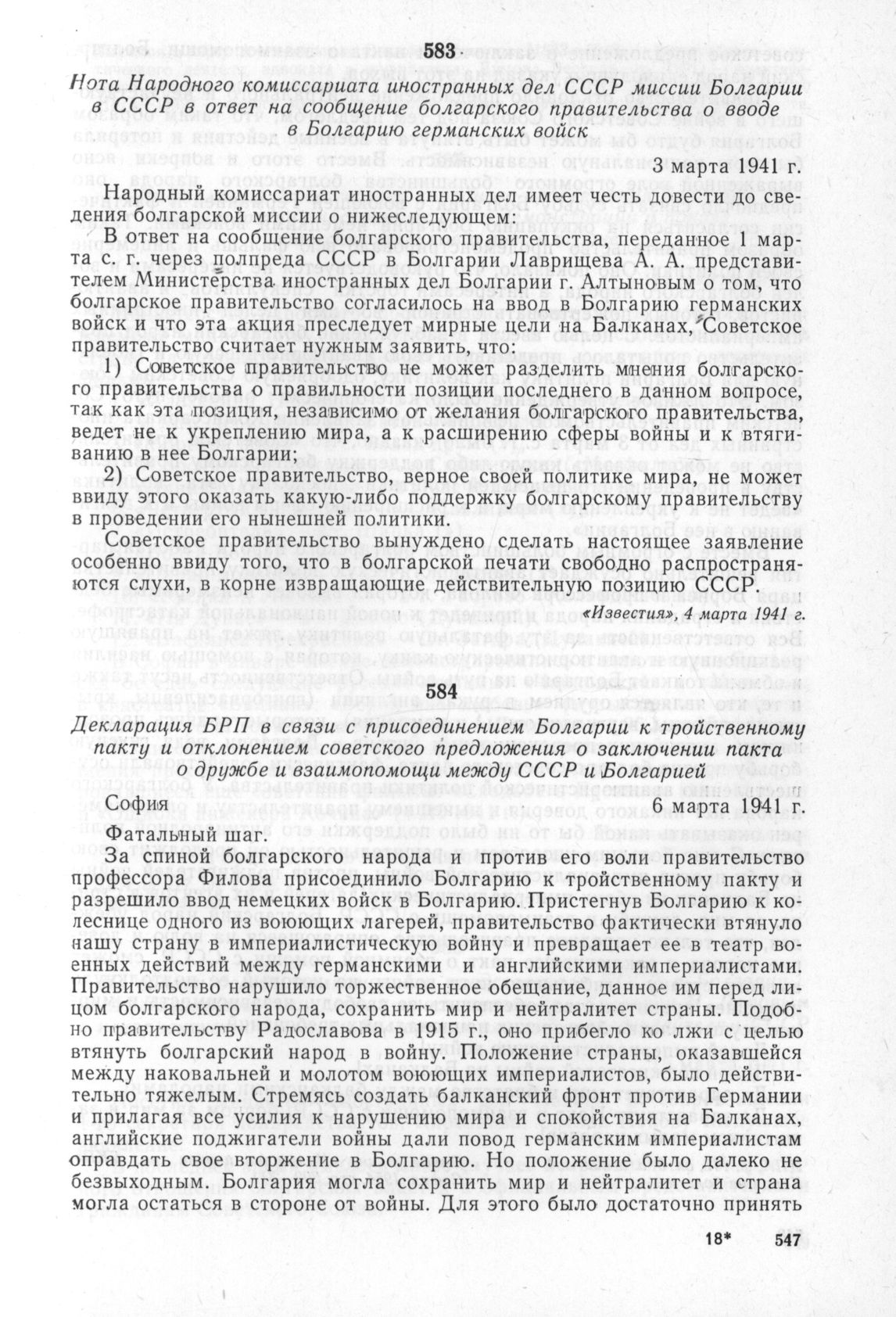 Декларация БРП в связи с присоединением Болгарии к тройственному пакту и отклонением советского предложения о заключении пакта о дружбе и взаимопомощи между СССР и Болгарией. София. 6 марта 1941 г. // ЦПА, ф. 147, оп. 3, а. е. 822, л. 1. Копия на болг. яз. Опубл. в кн.: «Нелегални позиви на БКП». София, 1954, стр. 309—311.