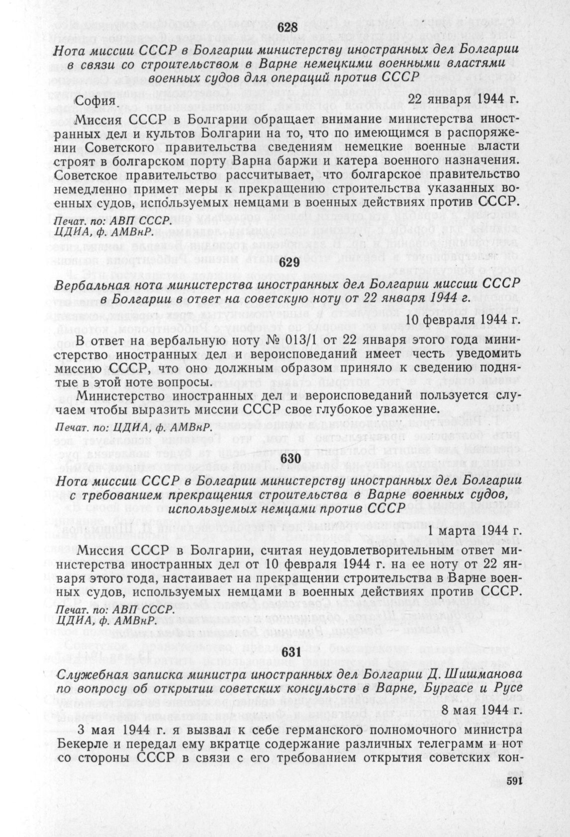 Вербальная нота министерства иностранных дел Болгарии миссии СССР в Болгарии в ответ на советскую ноту от 22 января 1944 г. 10 февраля 1944 г. // Печат. по: ЦДИА, ф. АМВнР.