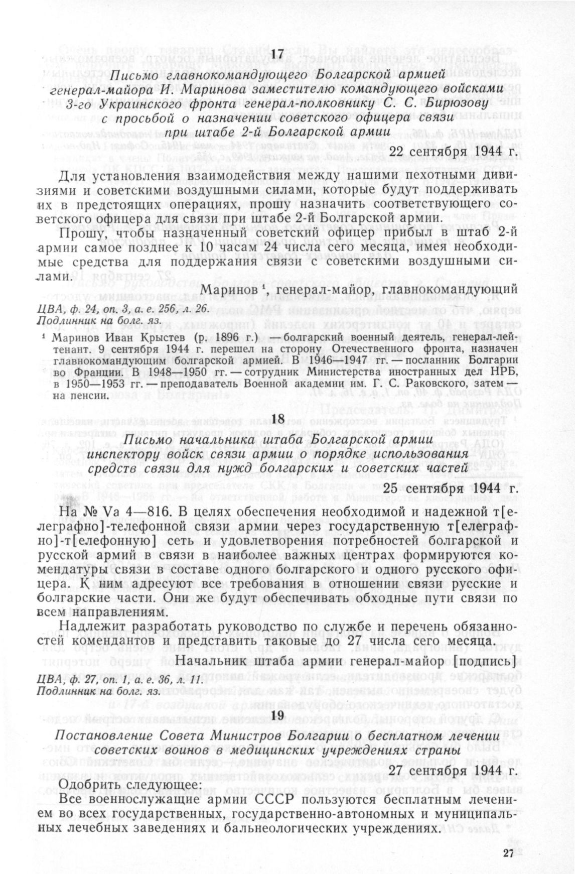 Письмо главнокомандующего Болгарской армией генерал-майора И. Маринова заместителю командующего войсками 3-го Украинского фронта генерал-полковнику С.С. Бирюзову с просьбой о назначении советского офицера связи при штабе 2-й Болгарской армии. 22 сентября 1944 г. // ЦВА, ф. 24, оп. 3, а. е. 256, л. 26. Подлинник на болг. яз.