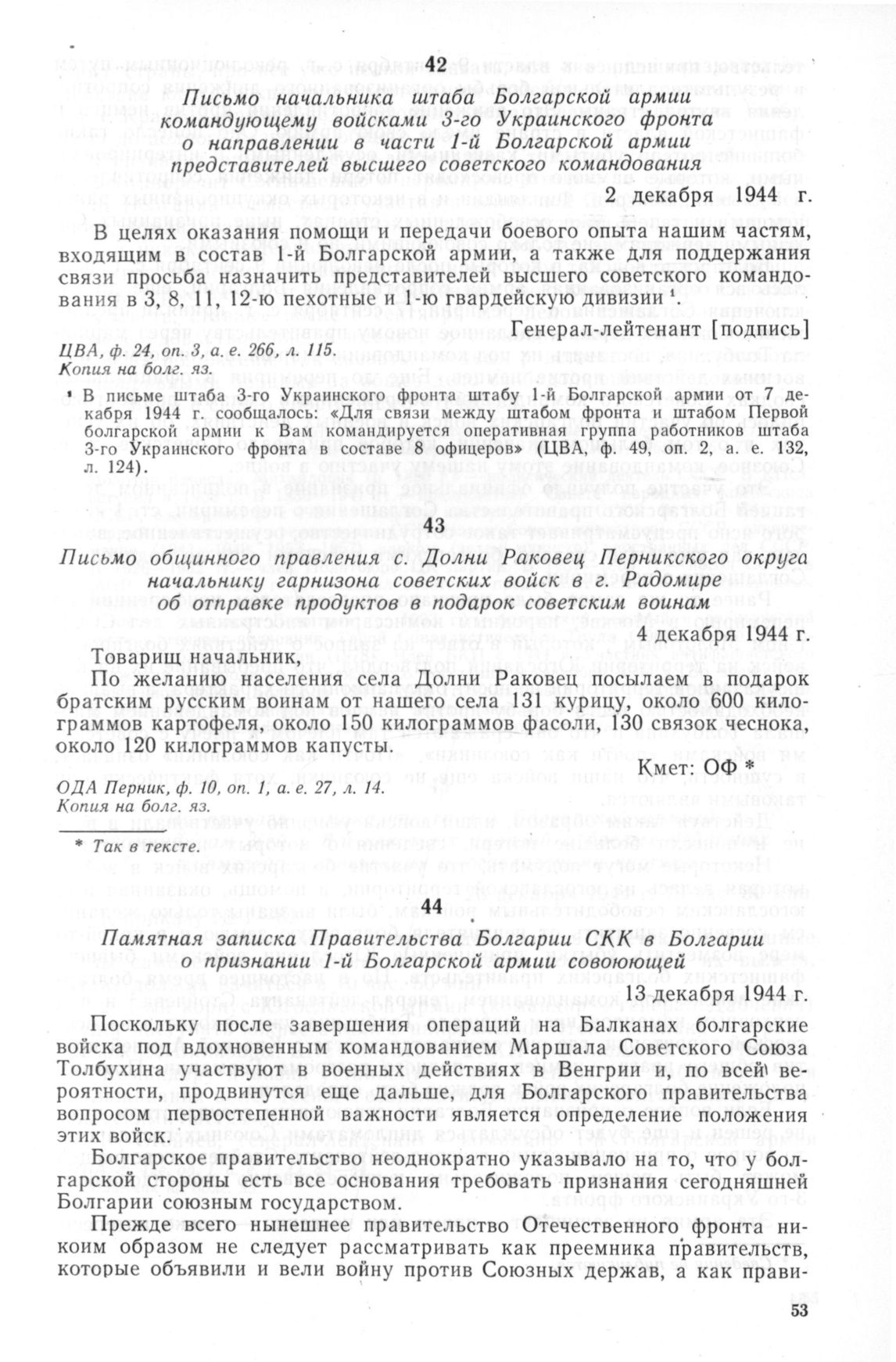 Письмо общинного правления с. Долни Раковец Перникского округа начальнику гарнизона советских войск в г. Радомире об отправке продуктов в подарок советским воинам. 4 декабря 1944 г.