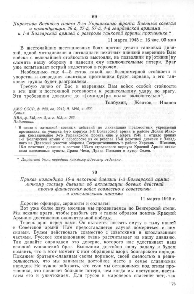 Приказ командира 16-й пехотной дивизии 1-й Болгарской армии личному составу дивизии об активизации боевых действий против фашистских войск совместно с советскими и югославскими частями. 11 марта 1945 г. // ЦВА, ф. 327, оп. 1, а. е. 25, л. 69—69 об. Подлинник на болг. яз.