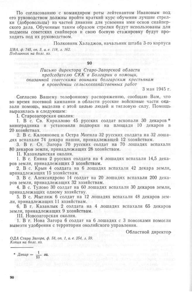 Письмо директора Старо-Загорской области председателю СКК в Болгарии о помощи, оказанной советскими воинами болгарским крестьянам в проведении сельскохозяйственных работ. 3 мая 1945 г. // ОДА Стара Загора, ф. 58, оп. 1, а. е. 254, л. 59. Копия на болг. яз.