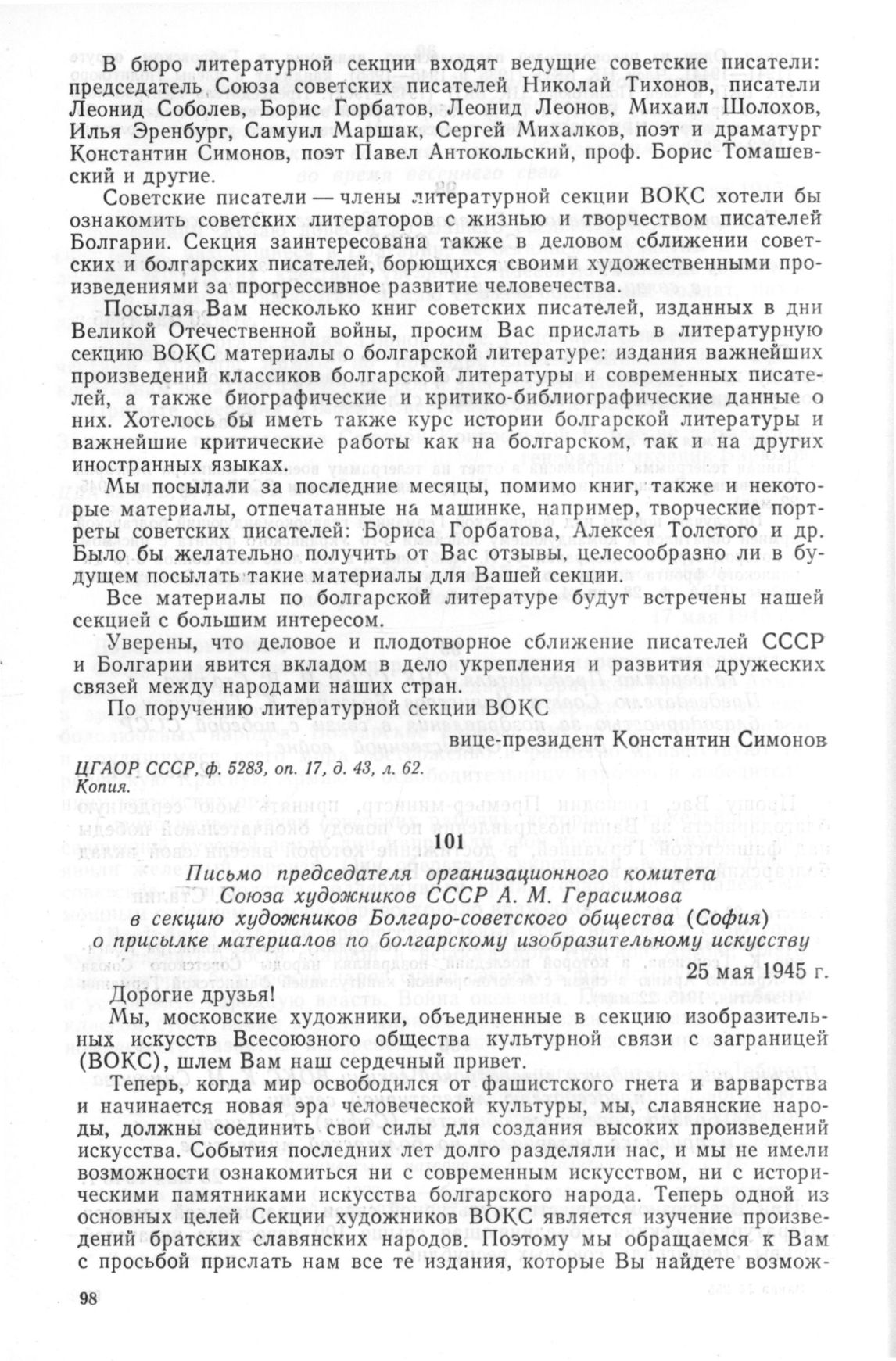 Письмо председателя организационного комитета Союза художников СССР А.М. Герасимова в секцию художников Болгаро-советского общества (София) о присылке материалов по болгарскому изобразительному искусству. 25 мая 1945 г. // ЦГАОР СССР, ф. 5283, оп. 17, д. 43, лл. 65—65 об. Копия.