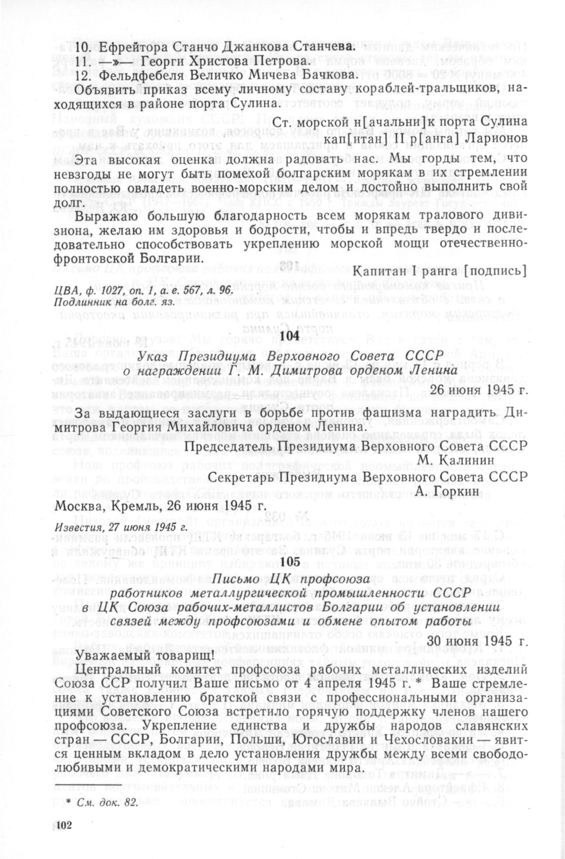 Указ Президиума Верховного Совета СССР о награждении Г.М. Димитрова орденом Ленина. 26 июня 1945 г. // Известия, 27 июня 1945 г.