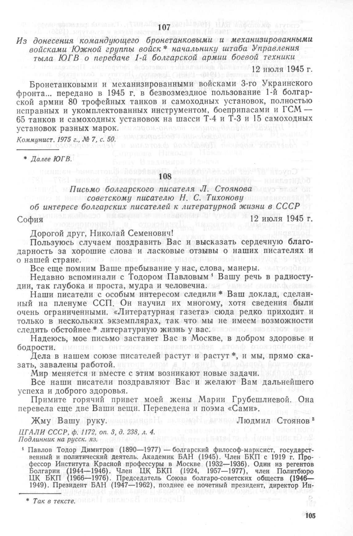 Письмо болгарского писателя Л. Стоянова советскому писателю Н.С. Тихонову об интересе болгарских писателей к литературной жизни в СССР. София. 12 июля 1945 г. // ЦГАЛИ СССР, ф. 1172, оп. 3, д. 238, л. 4. Подлинник на русск. яз.