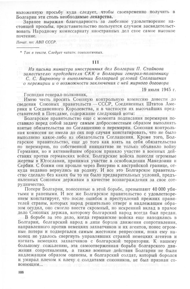 Из письма министра иностранных дел Болгарии П. Стайнова заместителю председателя СКК в Болгарии генерал-полковнику С.С. Бирюзову о выполнении Болгарией условий Соглашения о перемирии и о возможности заключения с ней мирного договора. 19 июля 1945 г. // Печат. по сб.: Советско-болгарские отношения. 1944—1948 гг. Документы и материалы. М.: Политиздат, 1969, с. 144—147.
