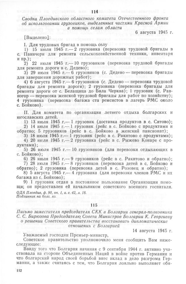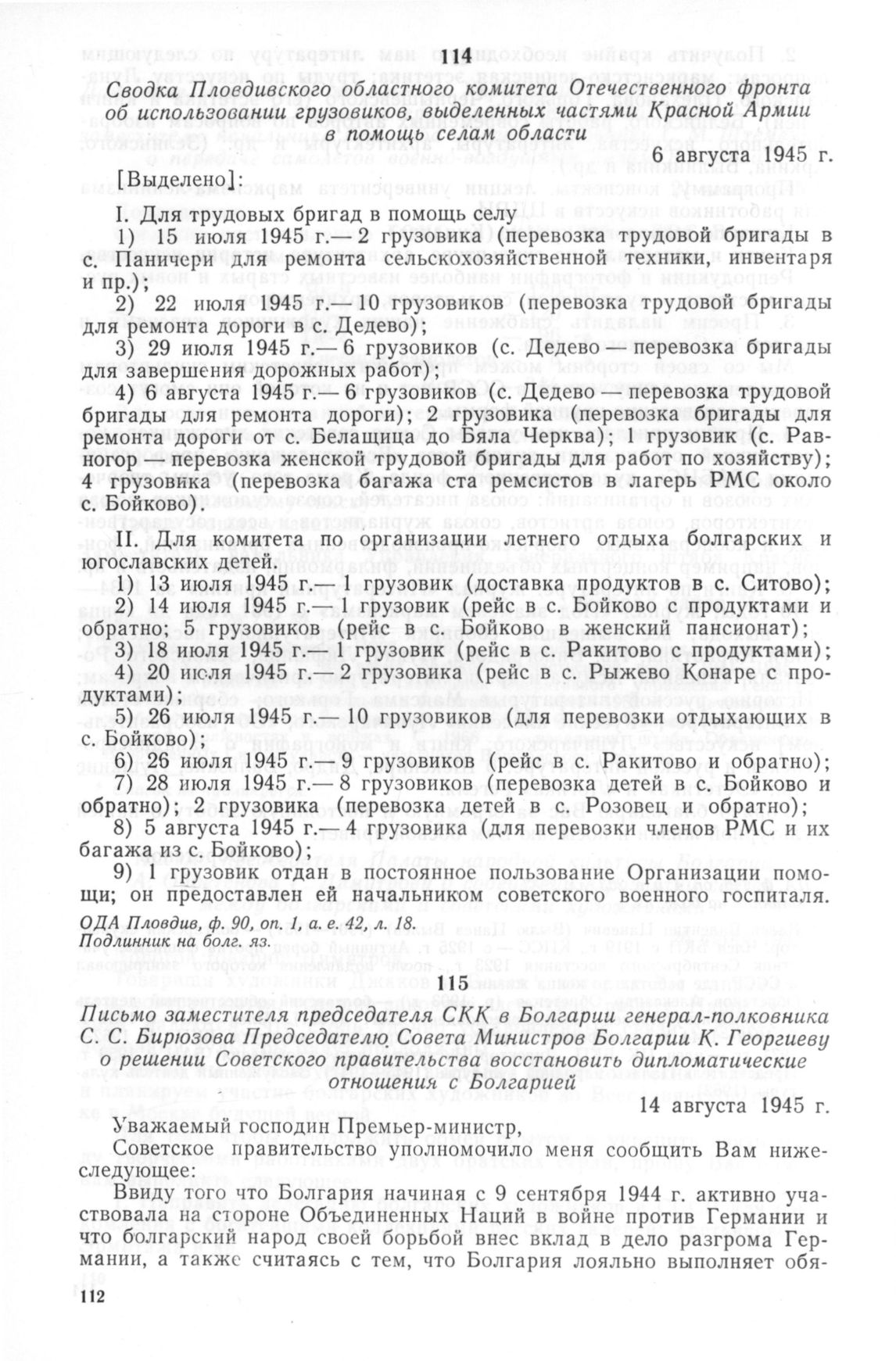Письмо заместителя председателя СКК в Болгарии генерал-полковника С.С. Бирюзова Председателю. Совета Министров Болгарии К. Георгиеву о решении Советского правительства восстановить дипломатические отношения с Болгарией. 14 августа 1945 г. // Печат. по сб.: Советско-болгарские отношения. 1944—1948 гг. Документы и материалы. М.: Политиздат, 1969, с. 169.