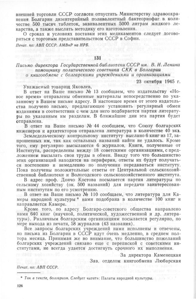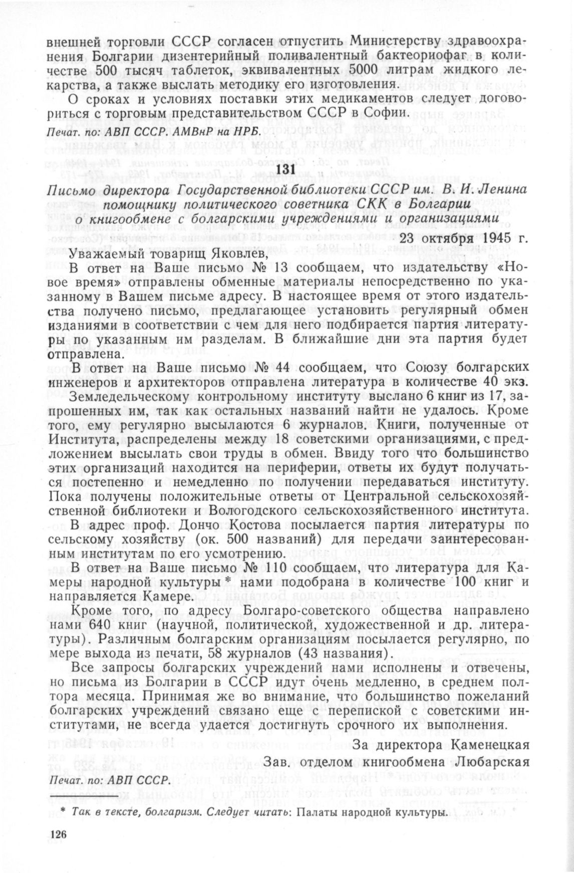 Письмо директора Государственной библиотеки СССР им. В.И. Ленина помощнику политического советника СКК в Болгарии о книгообмене с болгарскими учреждениями и организациями. 23 октября 1945 г. // Печат. по: АВП СССР.