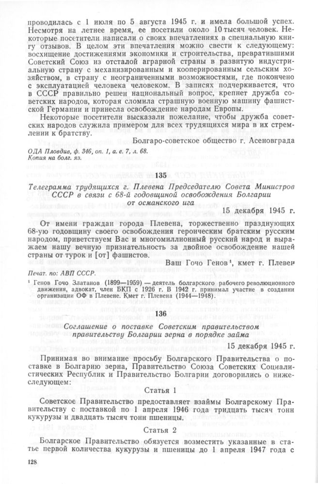 Телеграмма трудящихся г. Плевена Председателю Совета Министров СССР в связи с 68-й годовщиной освобождения Болгарии от османского ига. 15 декабря 1945 г. // Печат. по: АВП СССР.