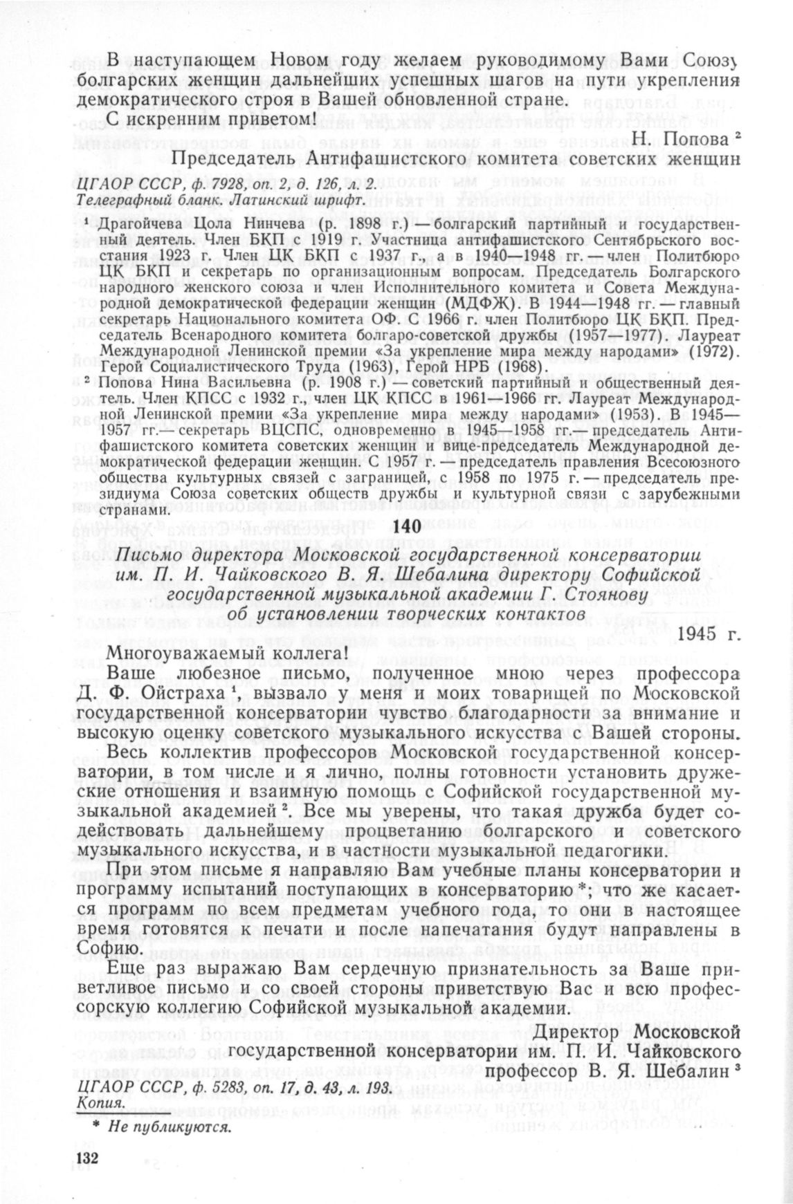 Письмо директора Московской государственной консерватории им. И. Чайковского В.Я. Шебалина директору Софийской государственной музыкальной академии Г. Стоянову об установлении творческих контактов. 1945 г. // ЦГАОР СССР, ф. 5283, оп. 17, д. 43, л. 193. Копия.