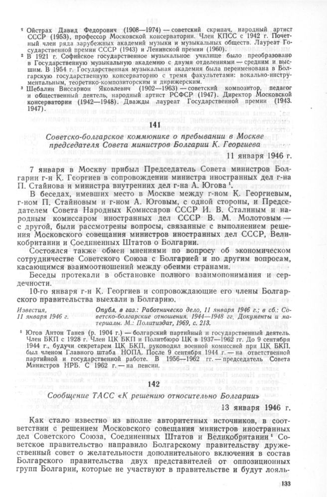 Сообщение ТАСС «К решению относительно Болгарии». 13 января 1946 г. // Известия, 13 января 1946 г. Опубл. в газ.: Работническо дело, 14 января 1946 г.; в сб.: Советско-болгарские отношения. 1944—1948 гг. Документы и материалы. М.: Политиздат, 1969, с. 213—215.