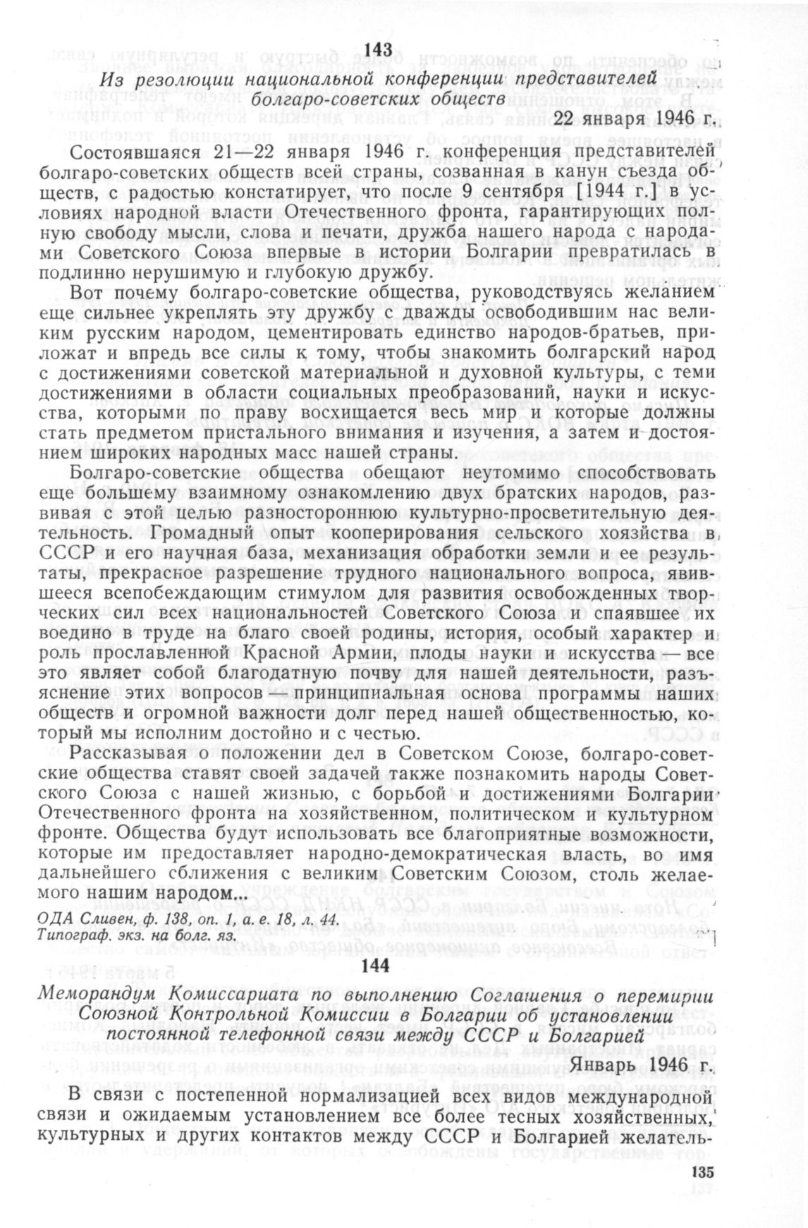 Меморандум Комиссариата по выполнению Соглашения о перемирии Союзной Контрольной Комиссии в Болгарии об установлении постоянной телефонной связи между СССР и Болгарией. Январь 1946 г. // Печат: по сб.: Советско-болгарские отношения. 1944—1948 гг. Документы и материалы. М.: Политиздат, 1969, с. 215—216.