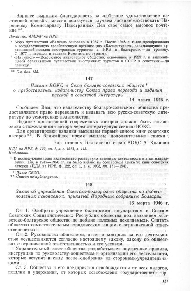 Письмо ВОКС в Союз болгаро-советских обществ о предоставлении издательству Союза права перевода и издания русской и советской литературы. 14 марта 1946 г. // ЦДА на НРБ, ф. 122, оп. 1, а. е. 1613, л. 113. Подлинник.