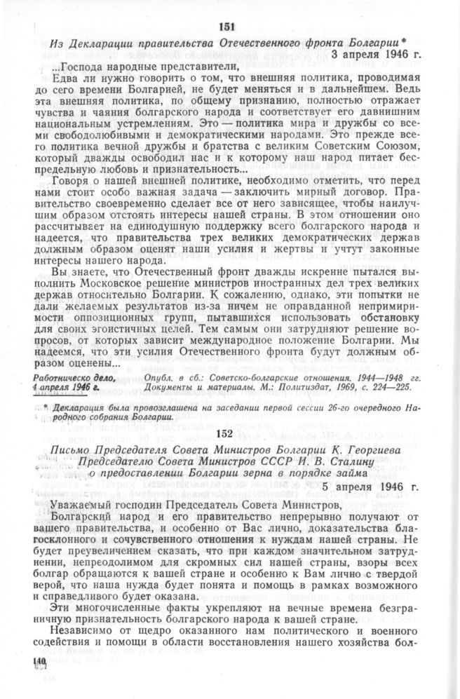 Из Декларации правительства Отечественного фронта Болгарии. 3 апреля 1946 г. // Работническо дело, 4 апреля 1946 г. Опубл. в сб.: Советско-болгарские отношения. 1944—1948 гг. Документы и материалы. М.: Политиздат, 1969, с. 224—225.