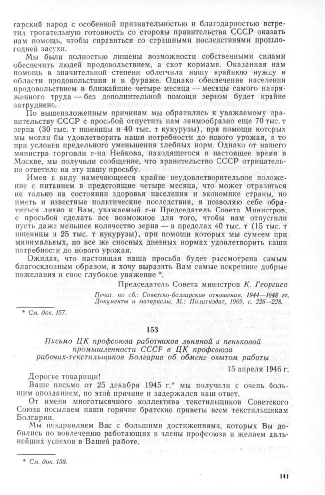 Письмо ЦК профсоюза работников льняной и пеньковой промышленности СССР в ЦК профсоюза рабочих-текстильщиков Болгарии об обмене опытом работы. 15 апреля 1946 г. // ЦГАОР СССР, ф. 5451, оп. 45, д. 66, лл. 229—231. Копия.