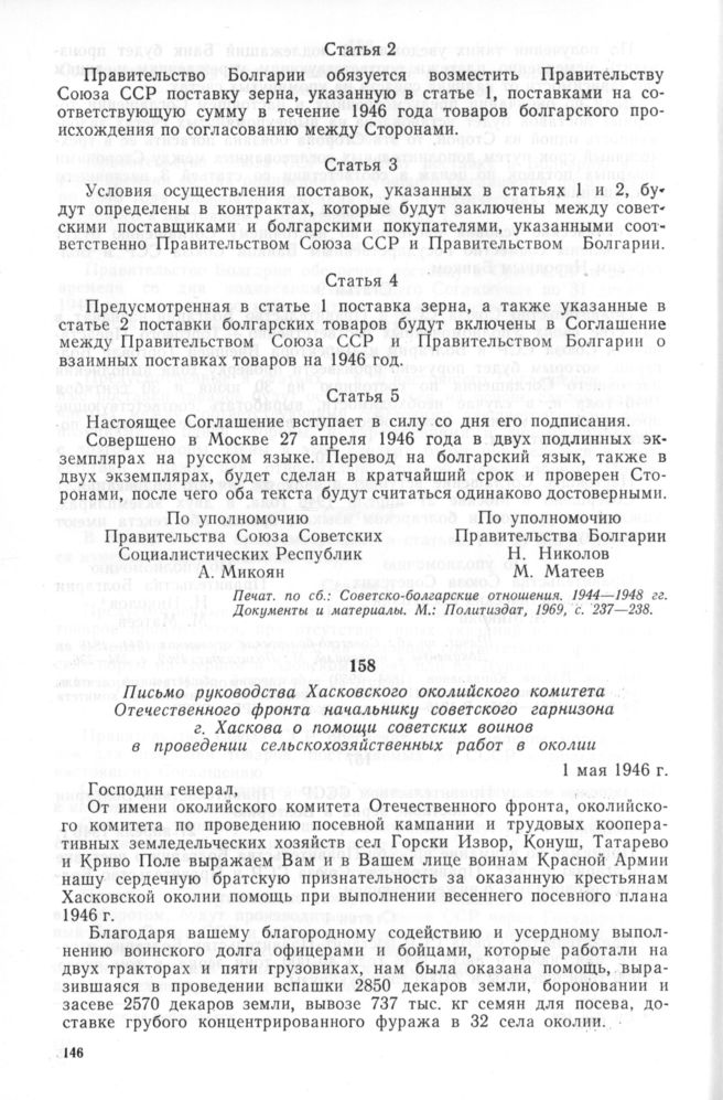 Письмо руководства Хасковского околийского комитета Отечественного фронта начальнику советского гарнизона г. Хаскова о помощи советских воинов в проведении сельскохозяйственных работ в околии. 1 мая 1946 г. // ОДА Хасково, ф. 62, оп. 1, а. е. 27, л. 13. Копия на болг. яз.