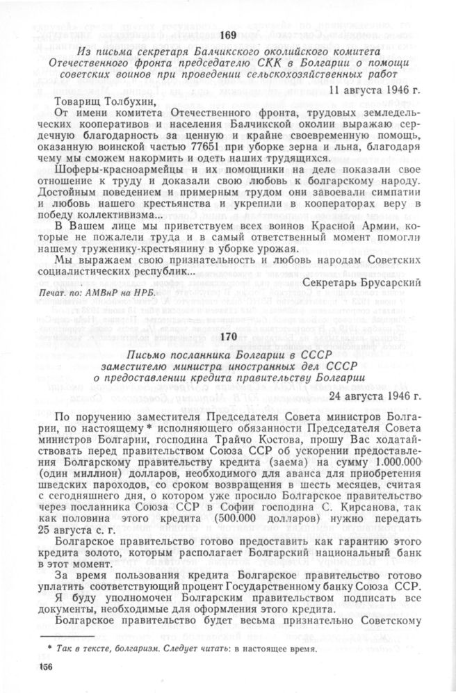 Письмо посланника Болгарии в СССР заместителю министра иностранных дел СССР о предоставлении кредита правительству Болгарии. 24 августа 1946 г. // Печат. по сб.: Советско-болгарские отношения. 1944—1948 гг. Документы и материалы. М.: Политиздат, 1969, с. 245.