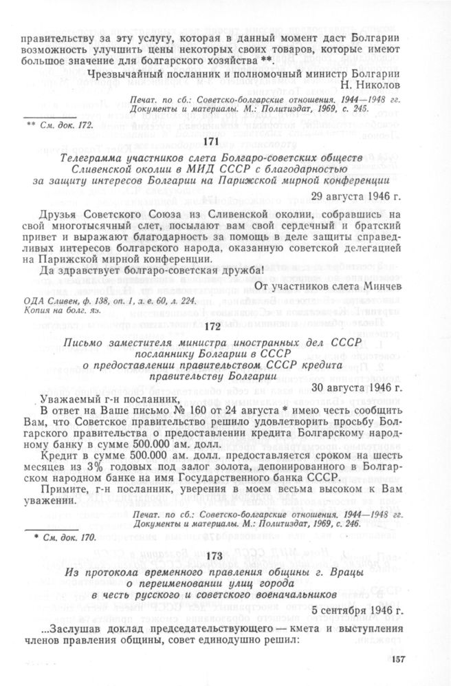 Письмо заместителя министра иностранных дел СССР посланнику Болгарии в СССР о предоставлении правительством СССР кредита правительству Болгарии. 30 августа 1946 г. // Печат. по сб.: Советско-болгарские отношения. 1944—1948 гг. Документы и материалы. М.: Политиздат, 1969, с. 246.