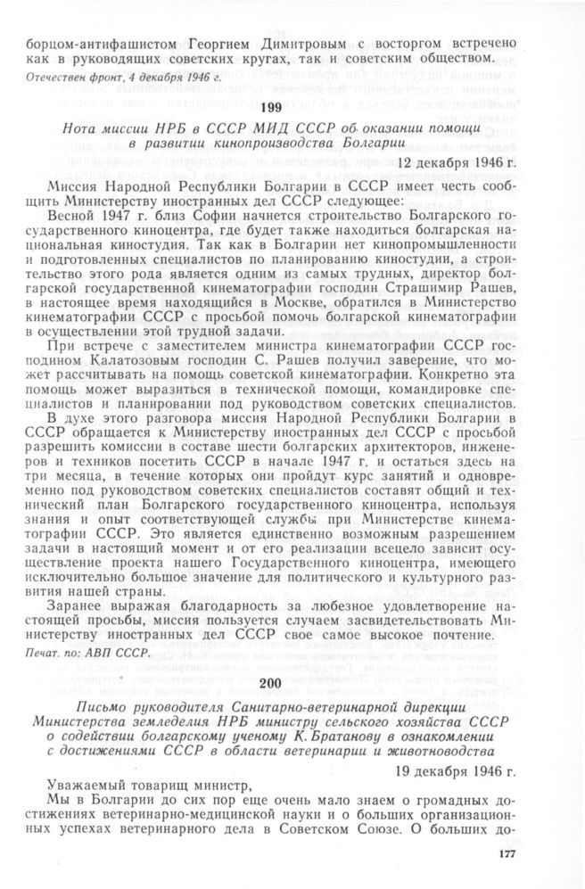 Нота миссии НРБ в СССР МИД СССР об оказании помощи в развитии кинопроизводства Болгарии. 12 декабря 1946 г. // Печат. по: АВП СССР.