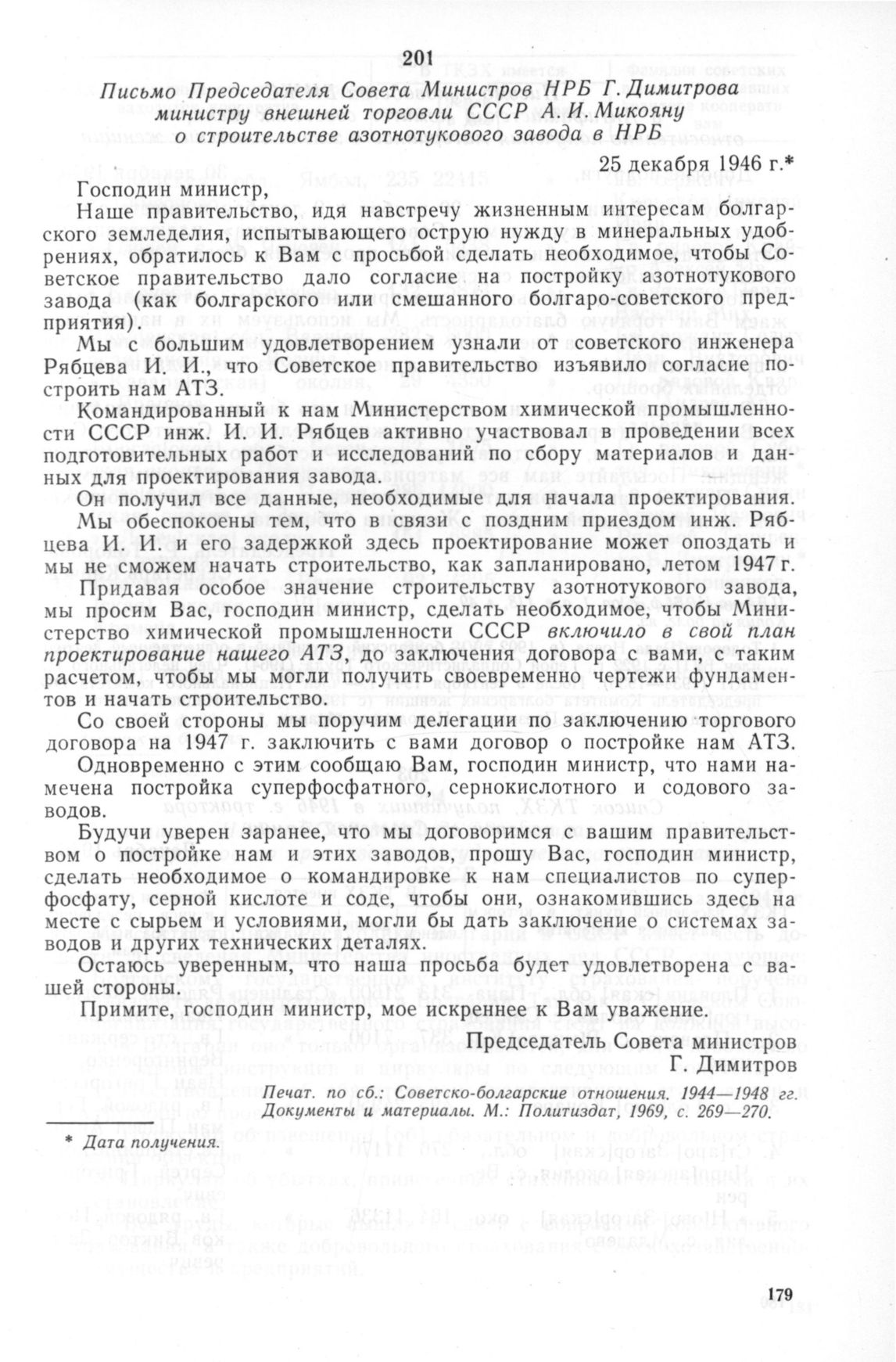 Письмо Председателя Совета Министров НРБ Г. Димитрова министру внешней торговли СССР А.И. Микояну о строительстве азотнотукового завода в НРБ. 25 декабря 1946 г. // Печат. по сб.: Советско-болгарские отношения. 1944—1948 гг. Документы и материалы. М.: Политиздат, 1969, с. 269—270.