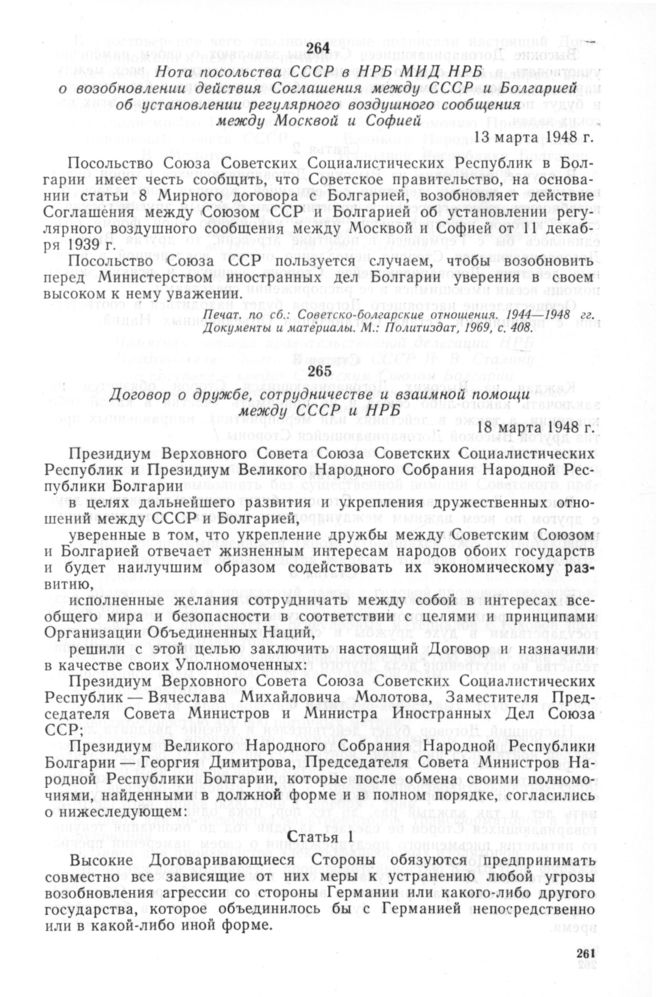 Нота посольства СССР в НРБ МИД НРБ о возобновлении действия Соглашения между СССР и Болгарией об установлении регулярного воздушного сообщения между Москвой и Софией. 13 марта 1948 г. // Печат. по сб.: Советско-болгарские отношения. 1944—1948 гг. Документы и материалы. М.: Политиздат, 1969, с. 408.
