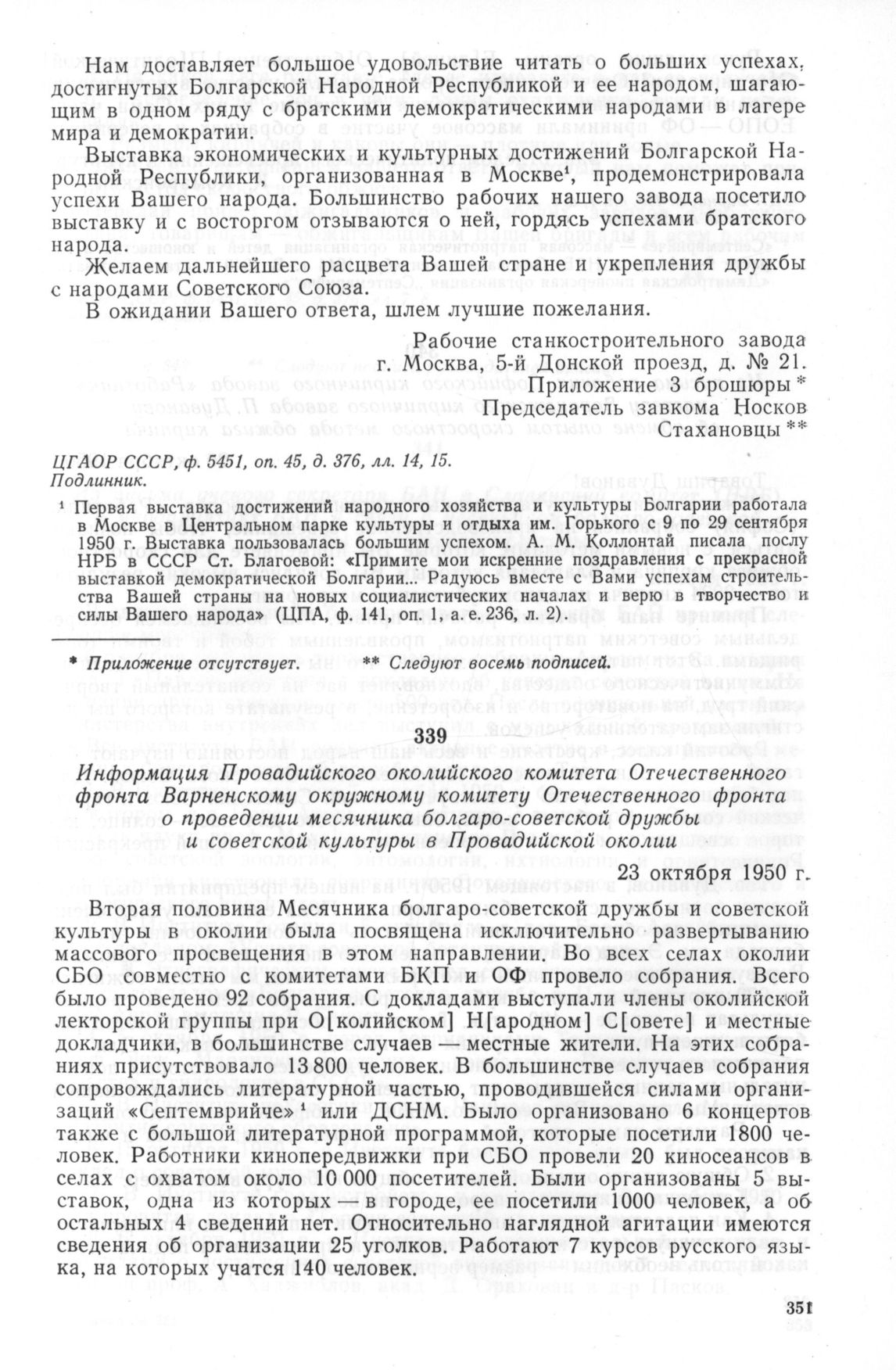 Информация Провадийского околийского комитета Отечественного фронта Варненскому окружному комитету Отечественного фронта о проведении месячника болгаро-советской дружбы, и советской культуры в Провадийской околии. 23 октября 1950 г. // ОДА Варна, ф. 455, оп. 1, а. е. 37. Подлинник на болг. яз.