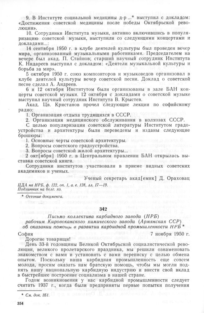 Письмо коллектива карбидного завода (НРБ) рабочим Кировоканского химического завода (Армянская ССР) об оказании помощи в развитии карбидной промышленности НРБ. София. 7 ноября 1950 г. // ЦГАОР СССР, ф. 5451, оп. 45, д. 508, лл. 24—25. Подлинник на болг. яз.