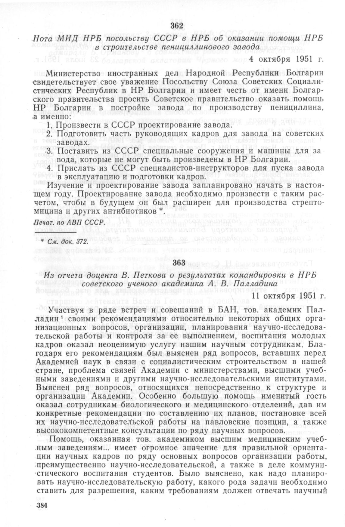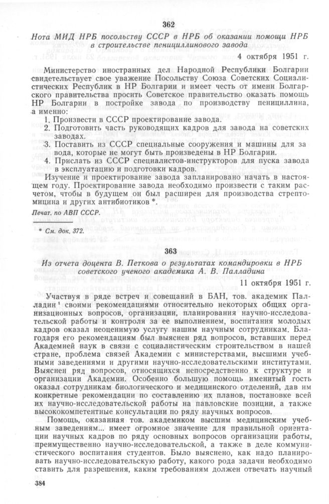 Нота МИД НРБ посольству СССР в НРБ об оказании помощи НРБ в строительстве пенициллинового завода. 4 октября 1951 г. // Печат. по АВП СССР.
