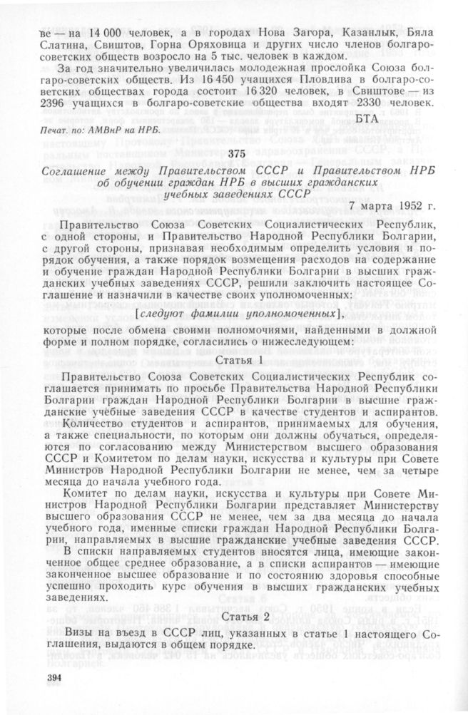 Соглашение между Правительством СССР и Правительством НРБ об обучении граждан НРБ в высших гражданских учебных заведениях СССР. 7 марта 1952 г. // Печат. по сб.: Советско-болгарские отношения. 1948—1970 гг. Документы и материалы. М.: Политиздат, 1974, с. 52—54. Опубл. в кн.: Сборник действующих договоров, соглашений и конвенций, заключенных СССР с иностранными государствами. М.: Политиздат, 1957, вып. XV, с. 262—263.