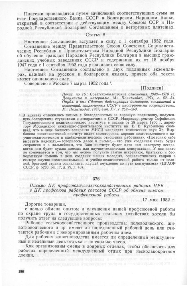 Письмо ЦК профсоюза сельскохозяйственных рабочих НРБ в ЦК профсоюза рабочих совхозов СССР об обмене опытом профсоюзной работы. 17 мая 1952 г. // ЦГАОР СССР, ф. 5451, оп. 45, д. 679, л. 151. Заверенная копия на русск. яз.