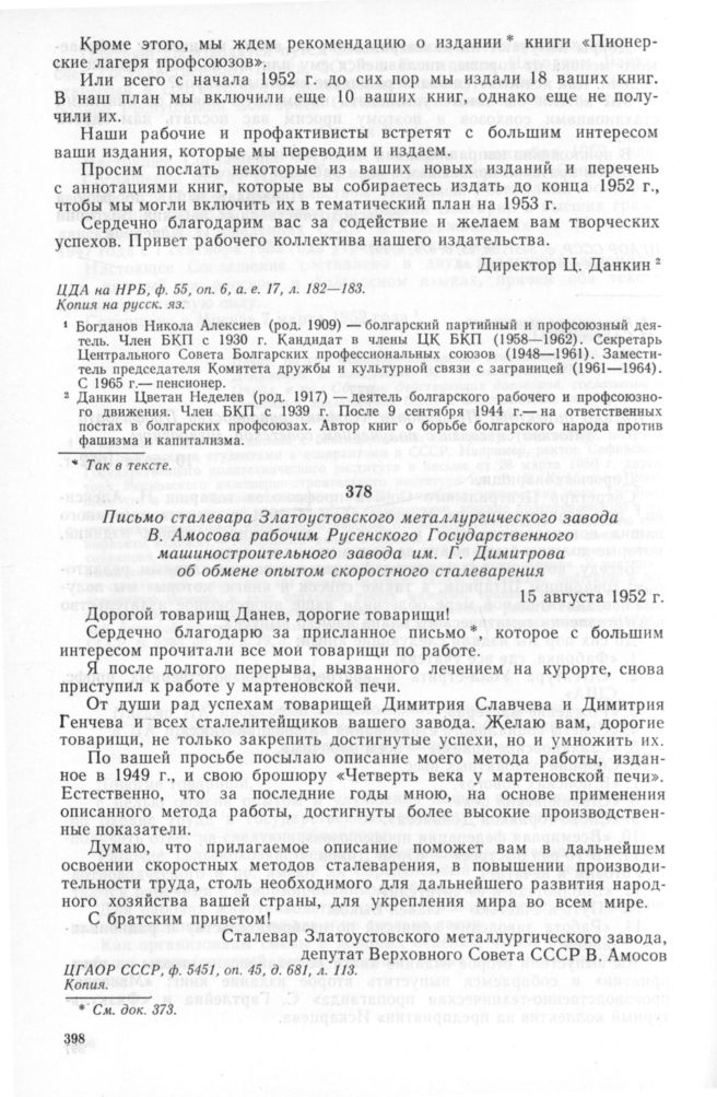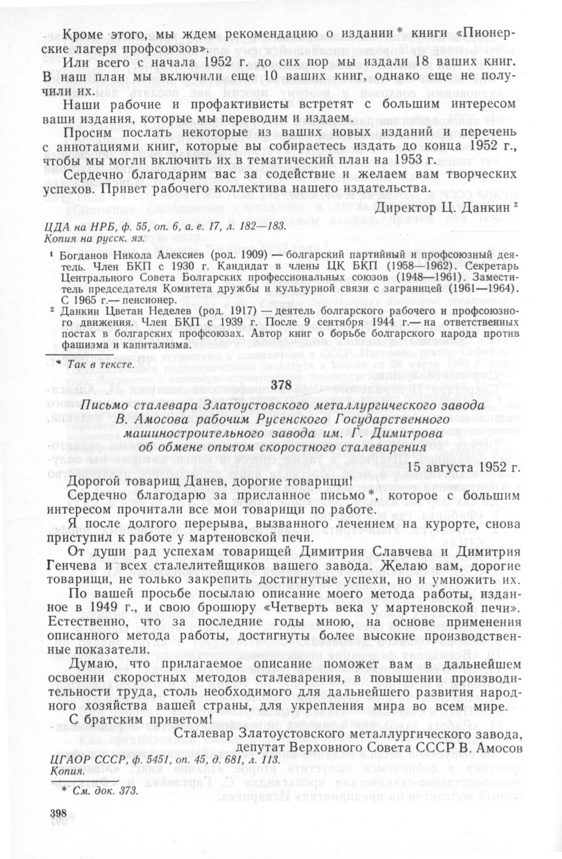 Письмо сталевара Златоустовского металлургического завода В. Амосова рабочим Русенского Государственного машиностроительного завода им. Г. Димитрова об обмене опытом скоростного сталеварения. 15 августа 1952 г.