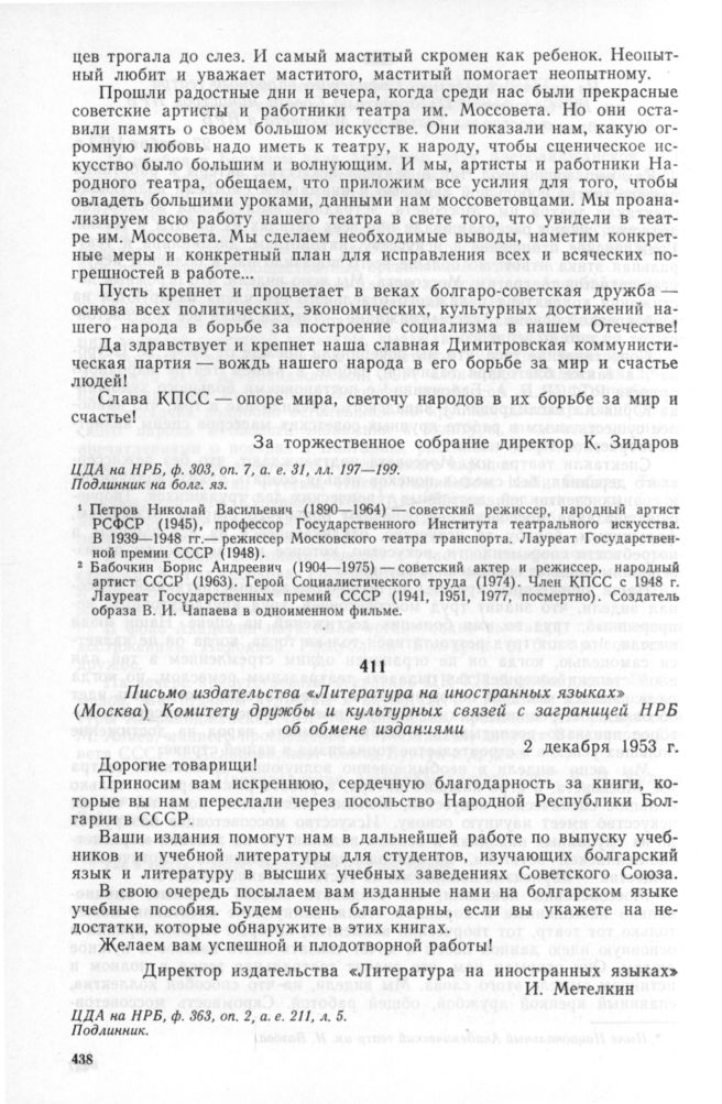 Письмо издательства «Литература на иностранных языках» (Москва) Комитету дружбы и культурных связей с заграницей НРБ об обмене изданиями. 2 декабря 1953 г. // ЦДА на НРБ, ф. 363, оп. 2, а. е. 211, л. 5. Подлинник.