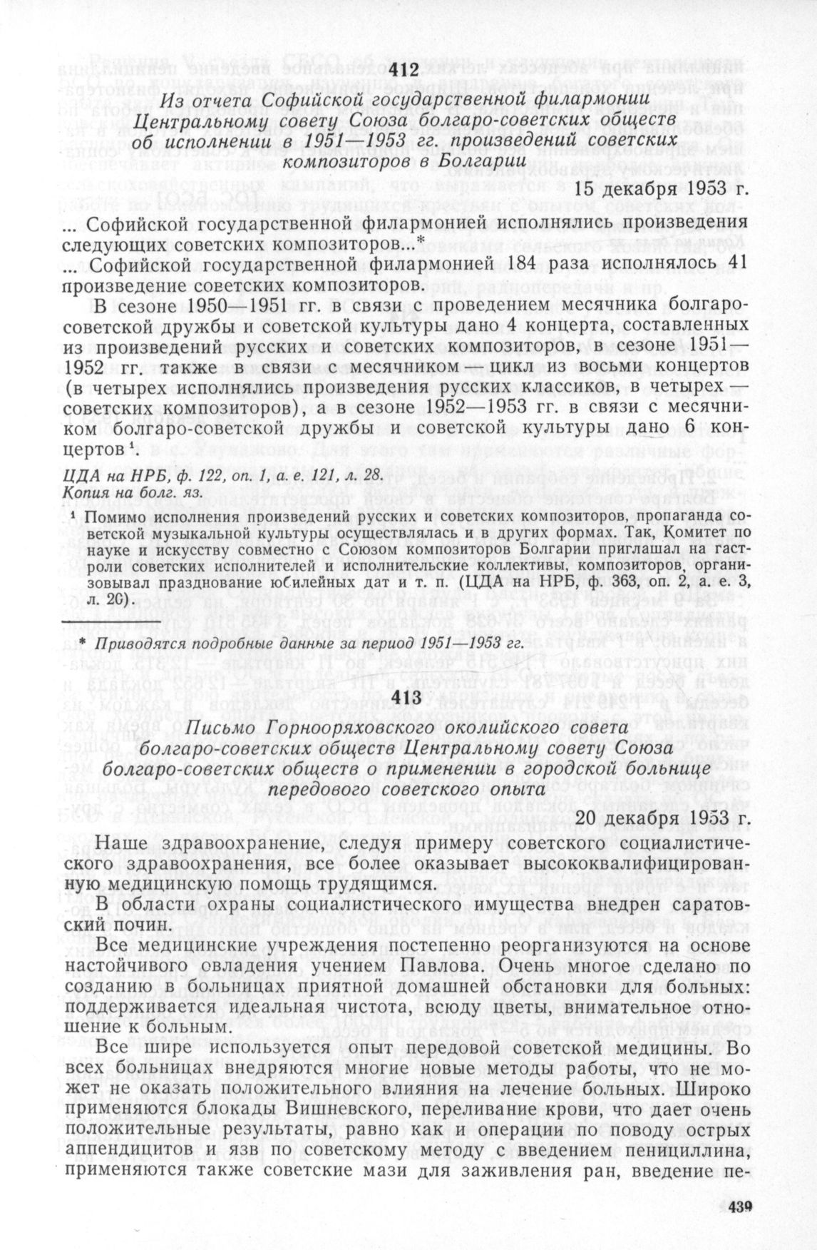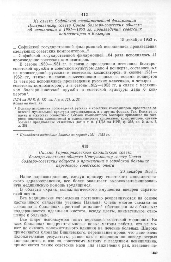 Из отчета Софийской государственной филармонии Центральному совету Союза болгаро-советских обществ об исполнении в 1951—1953 гг. произведений советских композиторов в Болгарии. 15 декабря 1953 г. // ЦДА на НРБ, ф. 122, оп. 1, а. е. 121, л. 28. Копия на болг. яз.