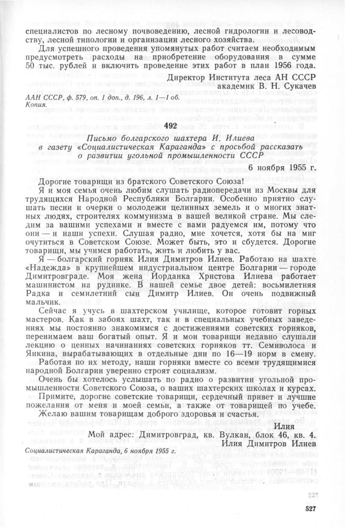 Письмо болгарского шахтера И. Илиева в газету «Социалистическая Караганда» с просьбой рассказать о развитии угольной промышленности СССР. 6 ноября 1955 г. // Социалистическая Караганда, 6 ноября 1955 г.