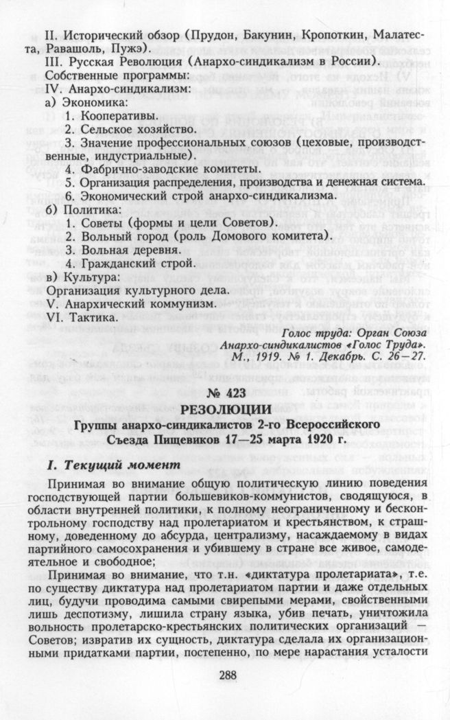 Резолюция группы анархо-синдикалистов 2-го всероссийского съезда пищевиков 17 — 25 марта 1920 г. // Вместо программы. [Берлин], 1922. С. 28—40.