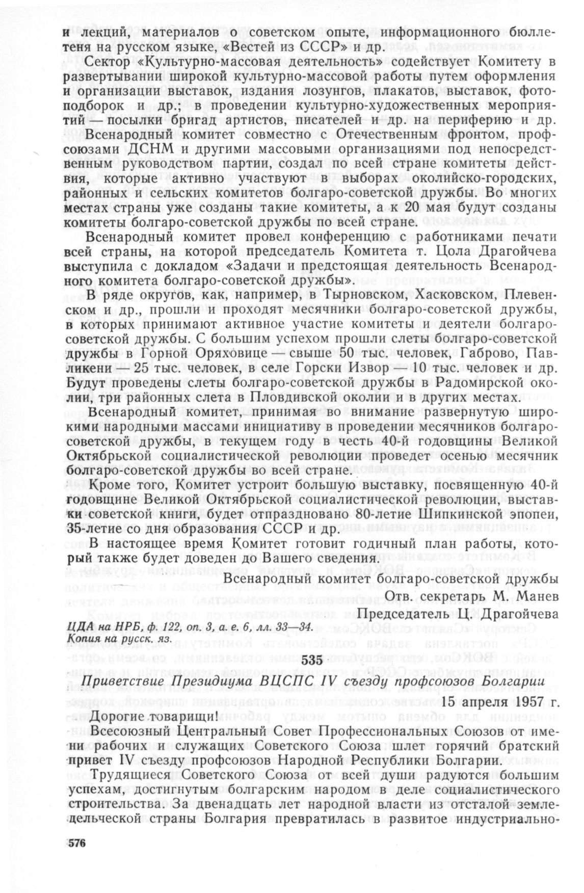 Приветствие Президиума ВЦСПС IV съезду профсоюзов Болгарии. 15 апреля 1957 г. // ЦГАОР СССР, ф. 5451, оп. 45, д. 1252, лл. 68—69. Типографский экз.
