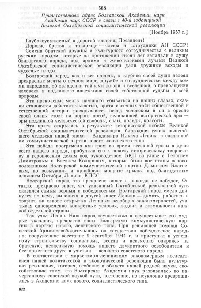 Приветственный адрес Болгарской Академии наук Академии наук СССР в связи с 40-й годовщиной Великой Октябрьской социалистической революции. [Ноябрь 1957 г.]