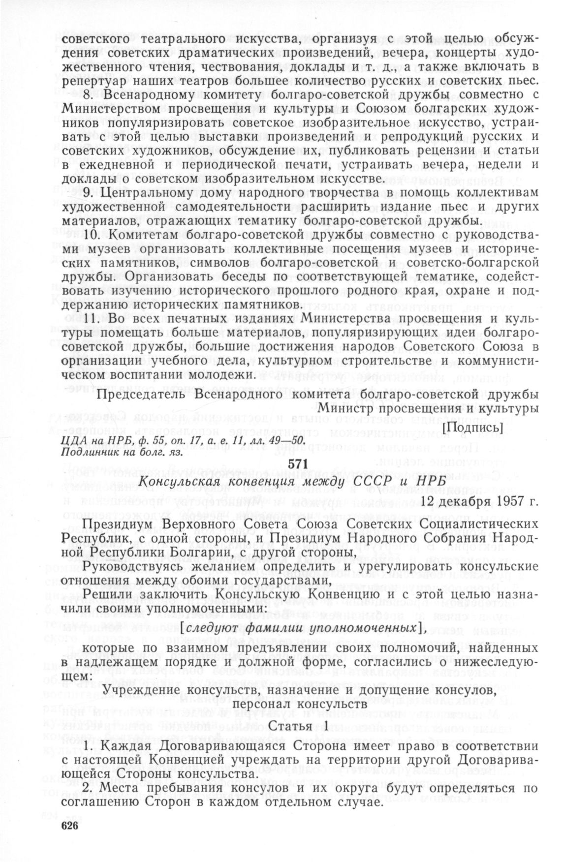 Консульская конвенция между СССР и НРБ. 12 декабря 1957 г. // Печат. по сб.: Советско-болгарские отношения. 1948—1970 гг. Документы и материалы. М.: Политиздат, 1974, с. 121—127; опубл. в кн.: Сборник действующих договоров, соглашений и конвенций, заключенных СССР с иностранными государствами. М.: Политиздат, 1961, вып. XX, с. 147—155.