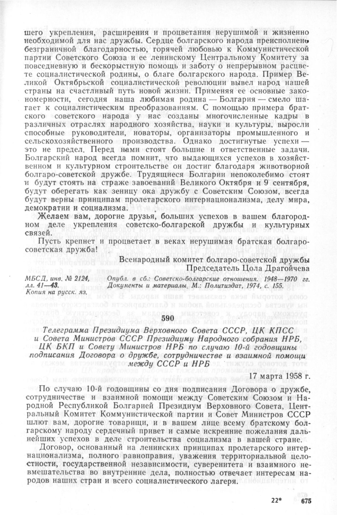 Телеграмма Президиума Верховного Совета СССР, ЦК КПСС и Совета Министров СССР Президиуму Народного собрания НРБ, ЦК БКП и Совету Министров НРБ по случаю 10-й годовщины подписания Договора о дружбе, сотрудничестве и взаимной помощи между СССР и НРБ. 17 марта 1958 г. // Правда, 18 марта 1958 г. Опубл. в газ.: Работническо дело, 18 марта 1958 г.; в сб.: Советско-болгарские отношения. 1948— 1970. гг. Документы и материалы. М.: Политиздат, 1974, с. 156.
