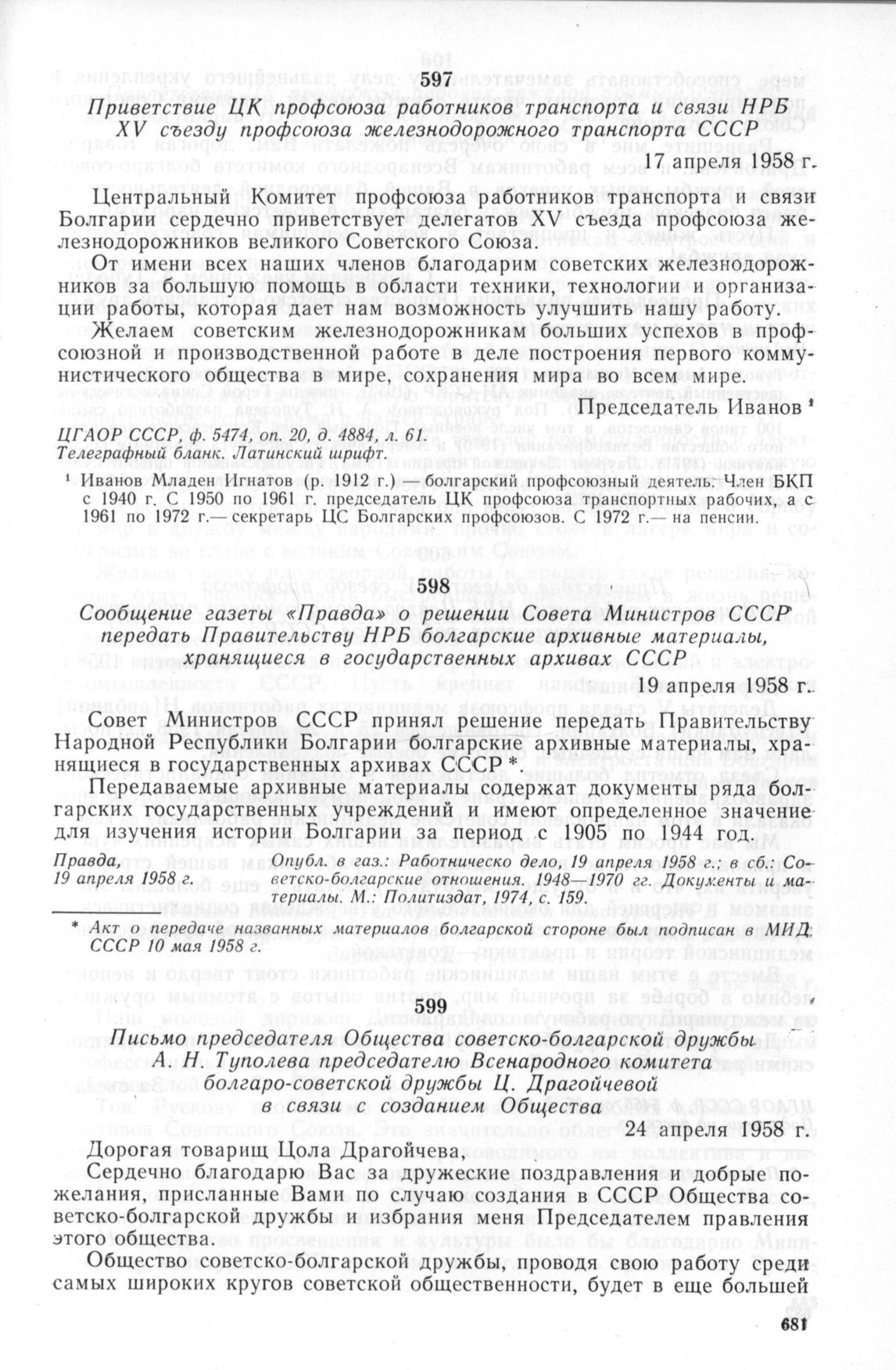 Сообщение газеты «Правда» о решении Совета Министров СССР передать Правительству НРБ болгарские архивные материалы, хранящиеся в государственных архивах СССР. 19 апреля 1958 г. // Правда, 19 апреля 1958 г. Опубл. в газ.: Работническо дело, 19 апреля 1958 г.: в сб.: Советско-болгарские отношения. 1948—1970 гг. Документы и материалы. М.: Политиздат, 1974, с. 159