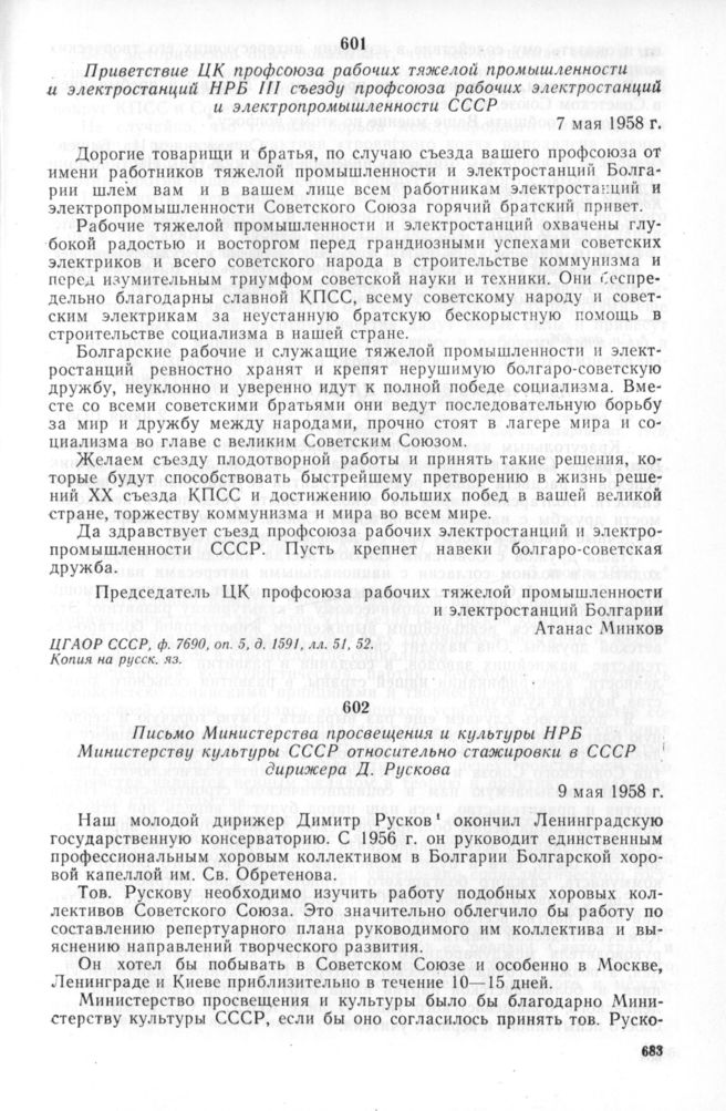 Приветствие ЦК профсоюза рабочих тяжелой промышленности и электростанций НРБ III съезду профсоюза рабочих электростанций и электропромышленности СССР. 7 мая 1958 г. // ЦГАОР СССР, ф. 7690, оп. 5, д. 1591, лл. 51, 52. Копия на русск. яз.