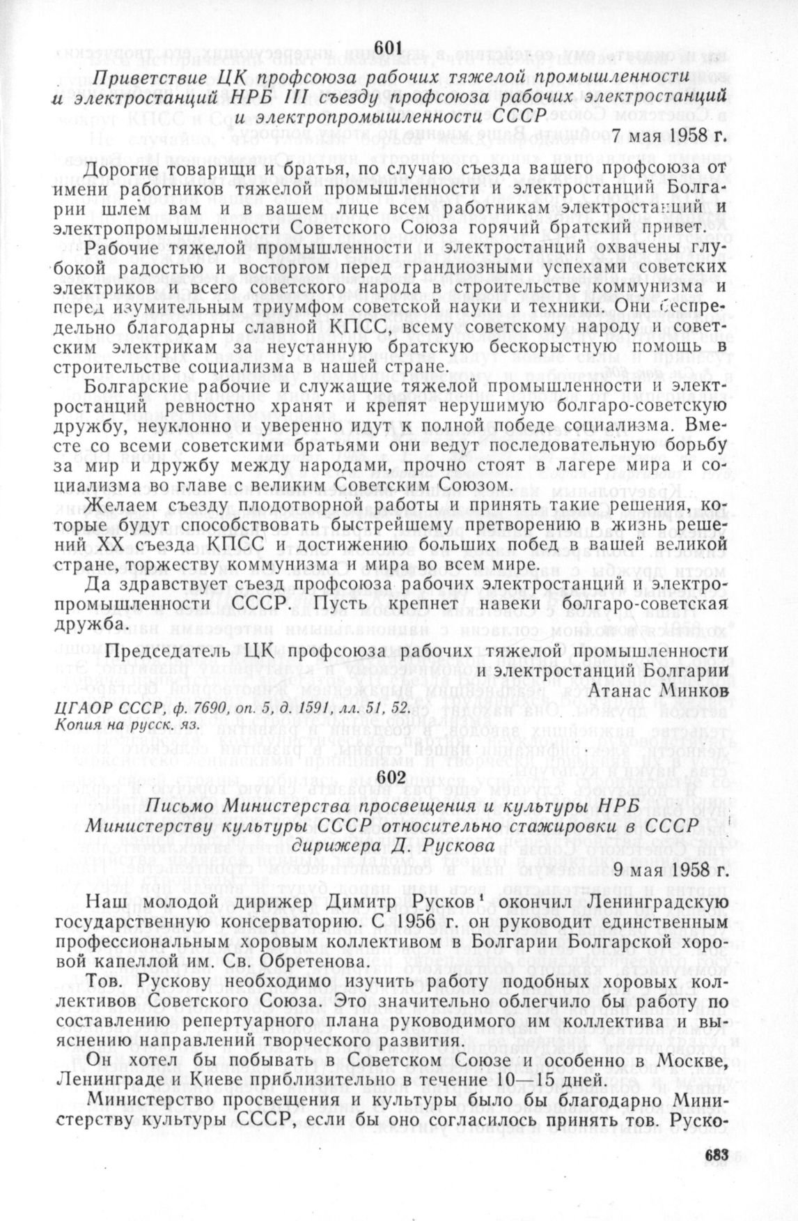 Письмо Министерства просвещения и культуры НРБ Министерству культуры СССР относительно стажировки в СССР дирижера Д. Рускова. 9 мая 1958 г. // ЦДА на НРБ ф. 468, оп. 2, а. е. 55, л. 73. Копия на болг. яз.