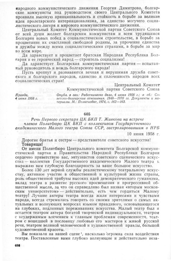 Речь Первого секретаря ЦК БКП Т. Живкова на встрече членов Политбюро ЦК БКП с коллективом Государственного академического Малого театра Союза ССР, гастролировавшим в НРБ. 10 июня 1958 г. // Печат. по кн.: Т. Живков. Избрани съчинения. София: Партиздат, 1975, т. 4, с. 219—223.