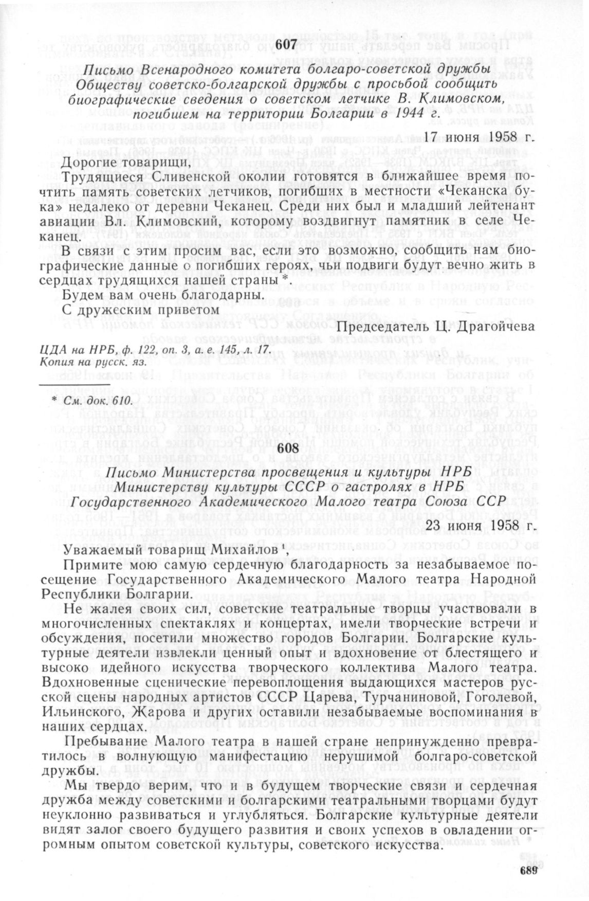 Письмо Министерства просвещения и культуры НРБ Министерству культуры СССР о гастролях в НРБ Государственного Академического Малого театра Союза ССР. 23 июня 1958 г. // ЦДА на НРБ, ф. 468, оп. 2, а. е. 55, л. 76. Копия на русск. яз.