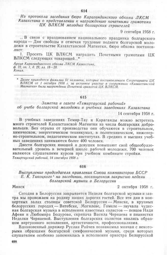 Заметка в газете «Темиртауский рабочий» об учебе болгарской молодежи в учебных заведениях Казахстана. 14 сентября 1958 г. // Темиртауский рабочий, 14 сентября 1958 г.