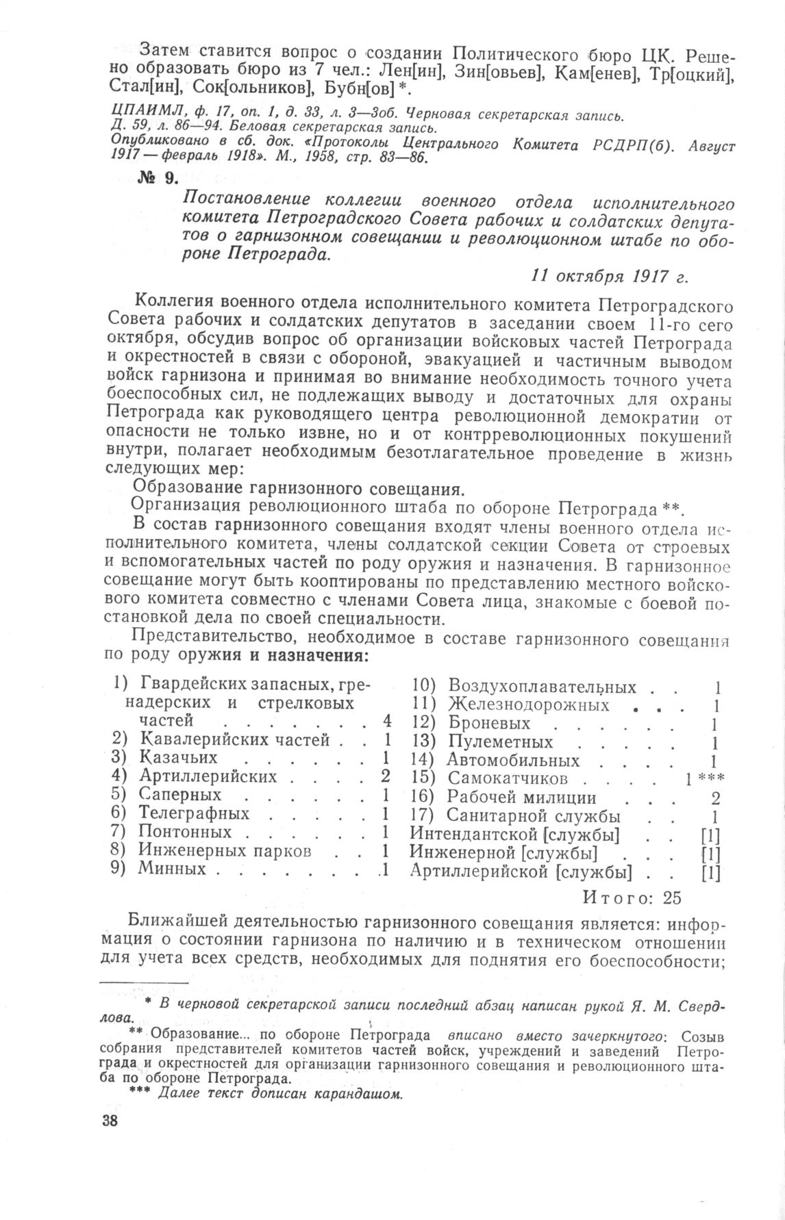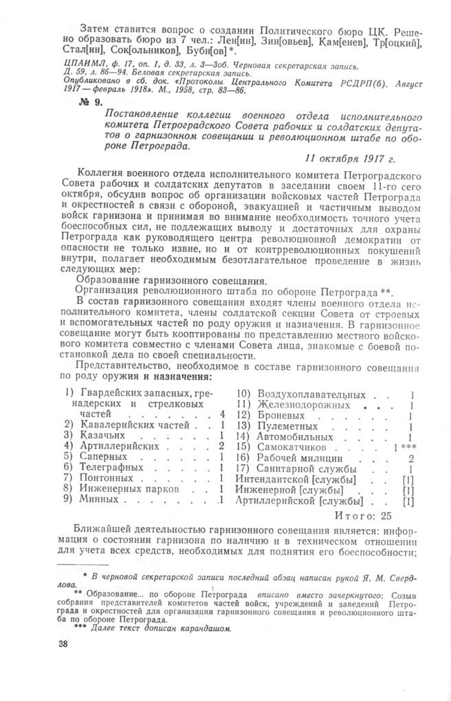 Постановление коллегии военного отдела исполнительного комитета Петроградского Совета рабочих и солдатских депутатов о гарнизонном совещании и революционном штабе по обороне Петрограда. 11 октября 1917 г. // ГАОРСС ЛО, ф. 7384, оп. 9, д. 346, л. 1. Черновик. Опубликовано в сб. «Октябрьское вооруженное восстание в Петрограде». М., 1957, стр. 204, 205.